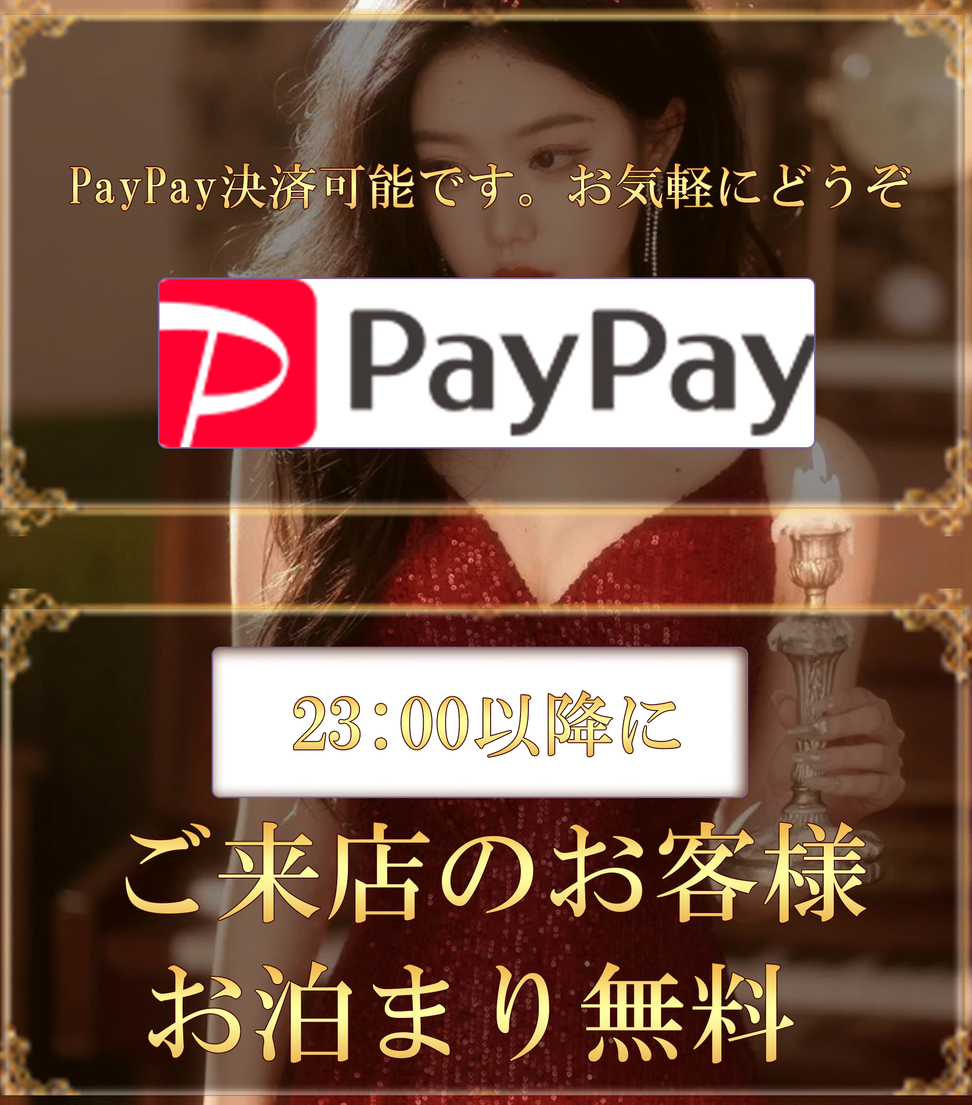 | 待 遇: | 完全全額日払い制 優しく笑顔でお客様に接客できる方、おしゃべりが好きな方。 出勤後に一時外出することもできます。 指圧整体等の経験者は優遇させていただきます。 |